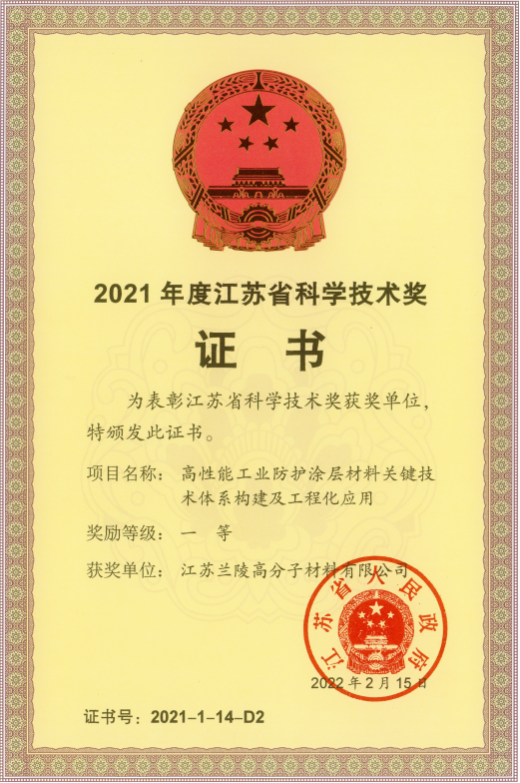 2019年被江蘇省工業(yè)和信息化廳評(píng)為江蘇省科技小巨人企業(yè)(制造類),2020年被評(píng)為中國(guó)涂料行業(yè)“十三五”高質(zhì)量發(fā)展企業(yè),被經(jīng)開(kāi)區(qū)授予2020年、2021年納稅大戶銀獎(jiǎng),同年被推選為常州市經(jīng)開(kāi)區(qū)第一屆商會(huì)理事會(huì)會(huì)長(zhǎng)單位,2021年被評(píng)為“常州市工業(yè)三星企業(yè)”,同年被國(guó)家工信部評(píng)為專精特新“小巨人”企業(yè),2022又被評(píng)為國(guó)家重點(diǎn)專精特新“小巨人”企業(yè)、國(guó)家知識(shí)產(chǎn)權(quán)優(yōu)勢(shì)企業(yè)。