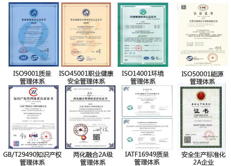 目前,公司已通過(guò)ISO9001質(zhì)量管理體系、ISO14001環(huán)境管理體系、ISO45001職業(yè)健康安全管理體系認(rèn)證、ISO50001能源管理體系、GB/T29490知識(shí)產(chǎn)權(quán)管理體系、兩化融合管理體系2A級(jí)、IATF16949質(zhì)量管理體系等認(rèn)證、安全生產(chǎn)標(biāo)準(zhǔn)化二級(jí)企業(yè)、英國(guó)勞氏認(rèn)證、消防產(chǎn)品認(rèn)證、江蘇精品認(rèn)證等等,見(jiàn)圖11。